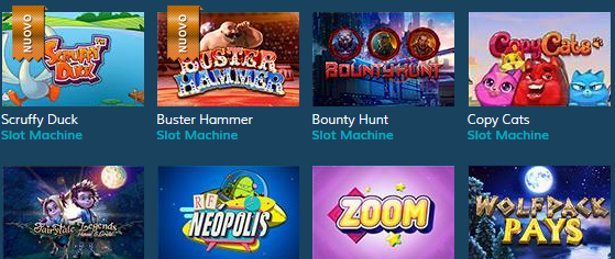 Vuoi un assaggio dei giochi casino disponibili? Ti segnaliamo Butterfly Staxx, Theatre Of The Night, Blazing Goddess, Scruffy Duck, Bounty Hunt, Hansel and Gretel Fairytale, Wolfpack Pays, Wild Wild West, Spinata Grande, Blood Suckers 2, Divine Fortune, Great Wild Elk, Big Foot Slot, Monster Wins, Wolf Cub, Starburst, Warlords.